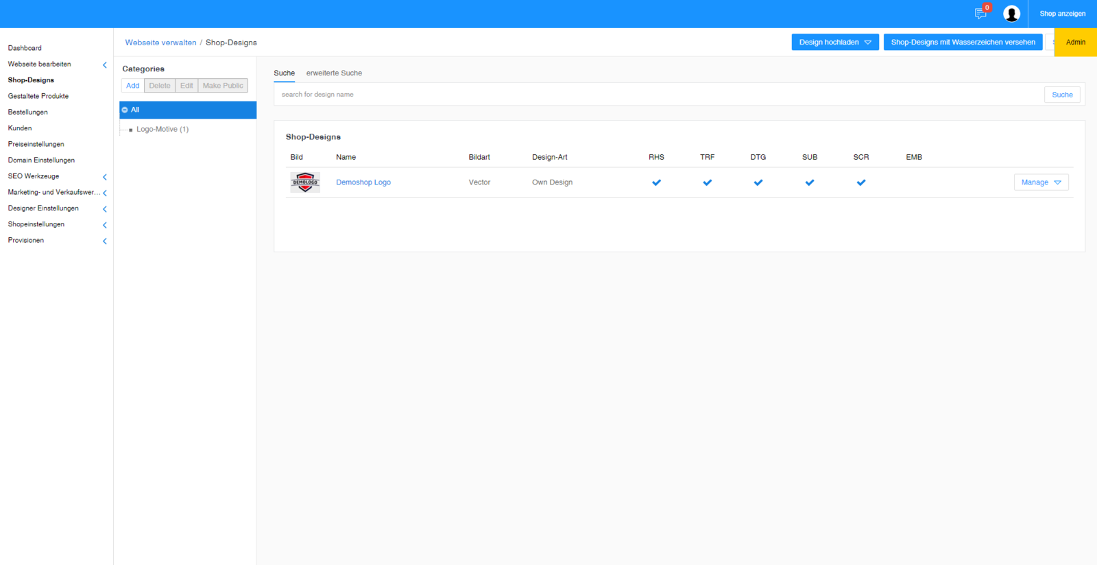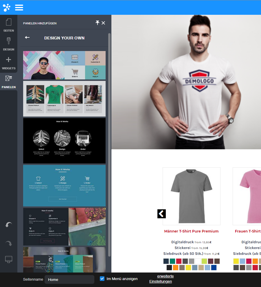 Über die Sidebar haben Sie Zugriff alle weiteren wichtigen Funktionen Ihres Backends, wie den Website-Editor, ihre Shop-Designs, Vorkonfigurierte Produkte, Bestellungen, Kunden, Preisoptionen sowie weitere Einstellungen.